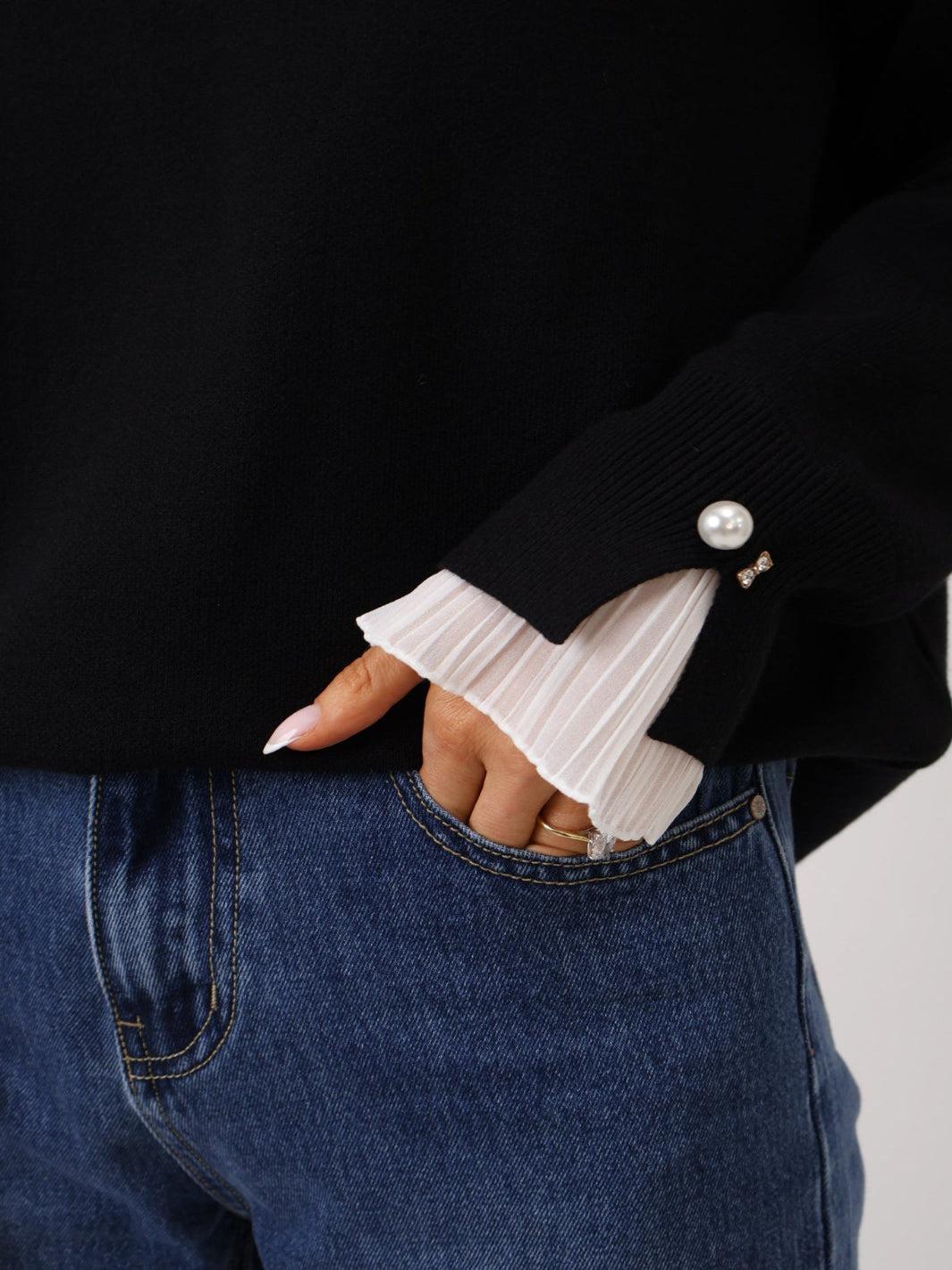 Add a touch of elegance to your everyday knitwear with the Gracie Frill Knit. This soft and cosy sweater is elevated by pleated frill cuffs and delicate pearl and diamanté button detailing. Perfect for pairing with tailored trousers or skirts, it blends comfort with a refined, feminine finish.