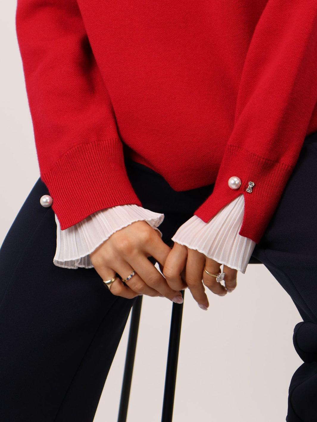 Add a touch of elegance to your everyday knitwear with the Gracie Frill Knit. This soft and cosy sweater is elevated by pleated frill cuffs and delicate pearl and diamanté button detailing. Perfect for pairing with tailored trousers or skirts, it blends comfort with a refined, feminine finish.